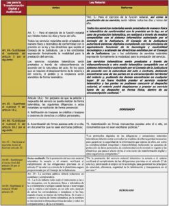 Con la entrada en vigor de la Ley para la Transformación Digital y Audiovisual, se reforma la Ley notarial en cuanto a la modalidad de prestación de servicios notariales, otorga un mayor papel al Consejo de la Judicatura en la regulación de la tecnología utilizada y establece condiciones en la prestación telemática, incluyendo la presencia de al menos una parte en la circunscripción territorial del notario, así como el desplazamiento físico del notario en circunstancias específicas.